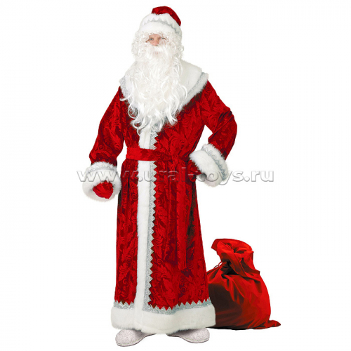 199-1 Карнавальный костюм "Дед Мороз велюр тиснение красный" (шуба, шапка, пояс, борода, мешок) р.54-56