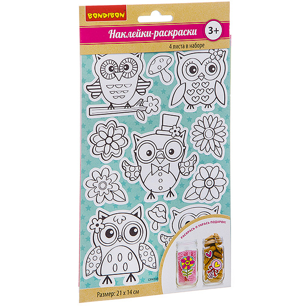 Набор наклеек-раскрасок BONDIBON, СОВЫ, 4 листа, CRD 25х14 см.