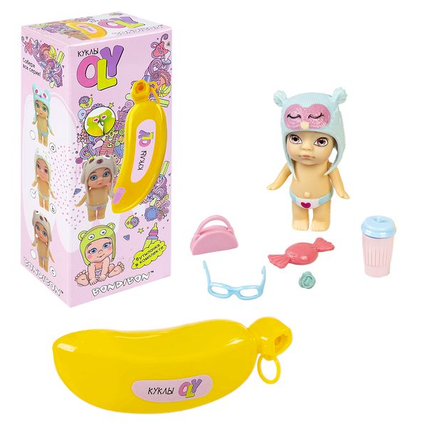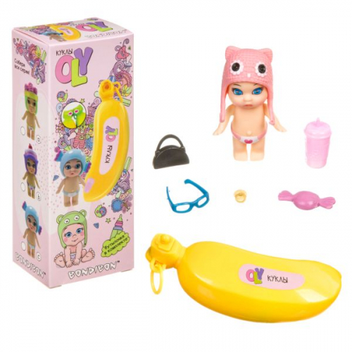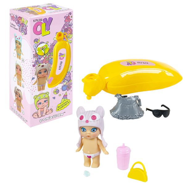 Набор игровой Bondibon куколка OLY в шапочке-ушанке с животным и аксессуарами в банане, ВОХ 15х6,6х1