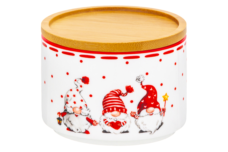 БЫЛО 378 руб! Банка д/хранения 250 мл 9,3*9,3*7 см "Весёлые гномики" + дер. крышка-подставка с крыш. с сил. уплот.