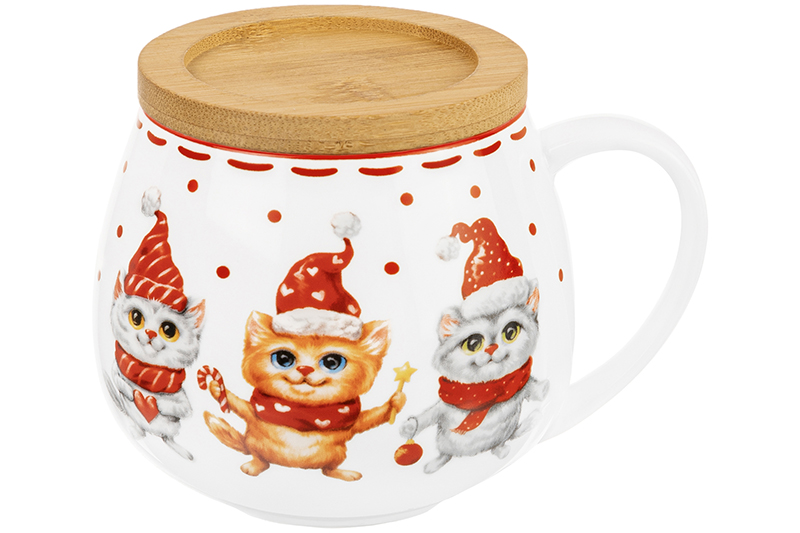 БЫЛО 559 руб! Кружка 400 мл 12,5*10*9,7 см "Котики" бочонок + крышка-подст.
