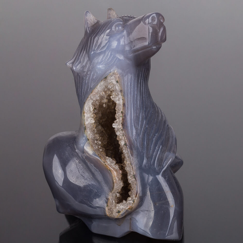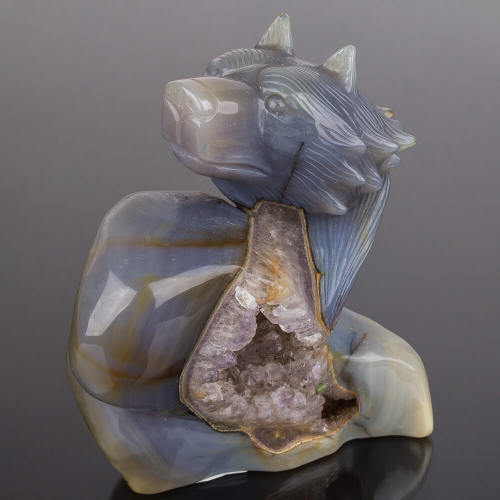 Радуга Самоцветов Волк резной из камня Агат серый с жеодой
