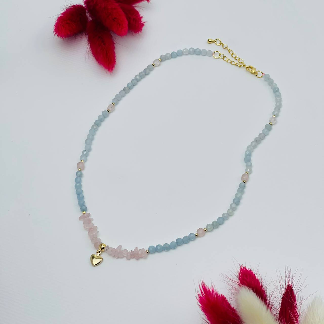 Радуга Самоцветов Бусы-Чокер из Аквамарина и Розового кварца с подвеской