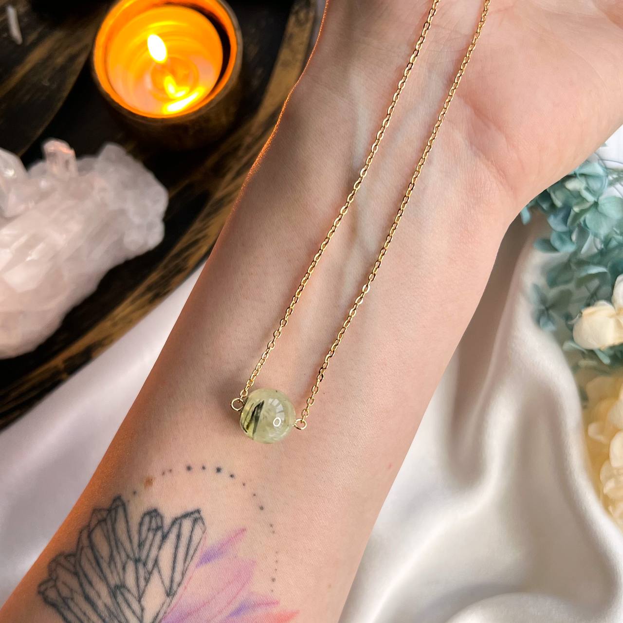 Радуга Самоцветов Кулон на цепочке из Пренита с включением Эпидота