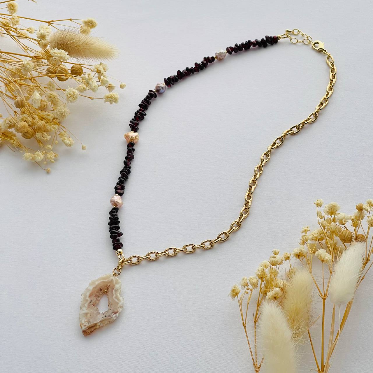 Радуга Самоцветов Колье из Граната и Жемчуга на цепочке с кулоном из Агата