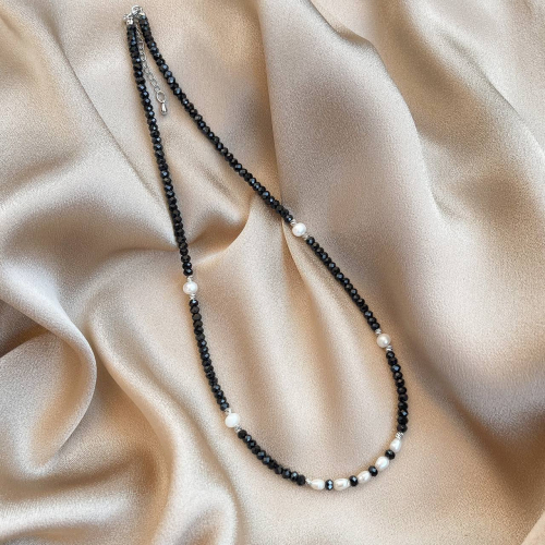 Радуга Самоцветов Бусы огранка из Шпинели чёрной и Жемчуга