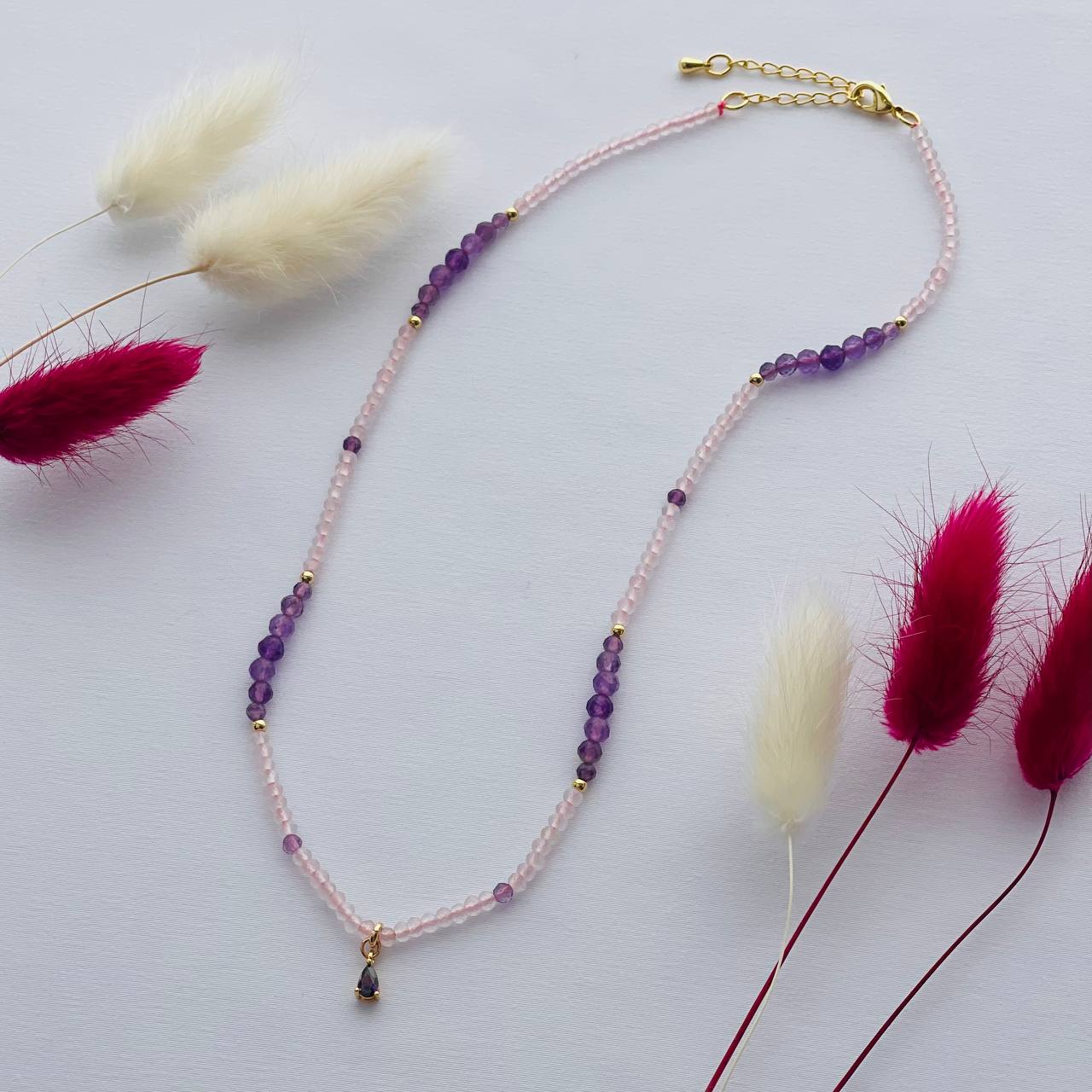 Радуга Самоцветов Бусы из Розового кварца и Аметиста с подвеской "Фианит"