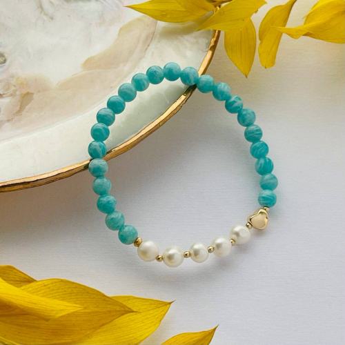 Радуга Самоцветов Браслет из Амазонита и Жемчуга со вставкой "Сердце"