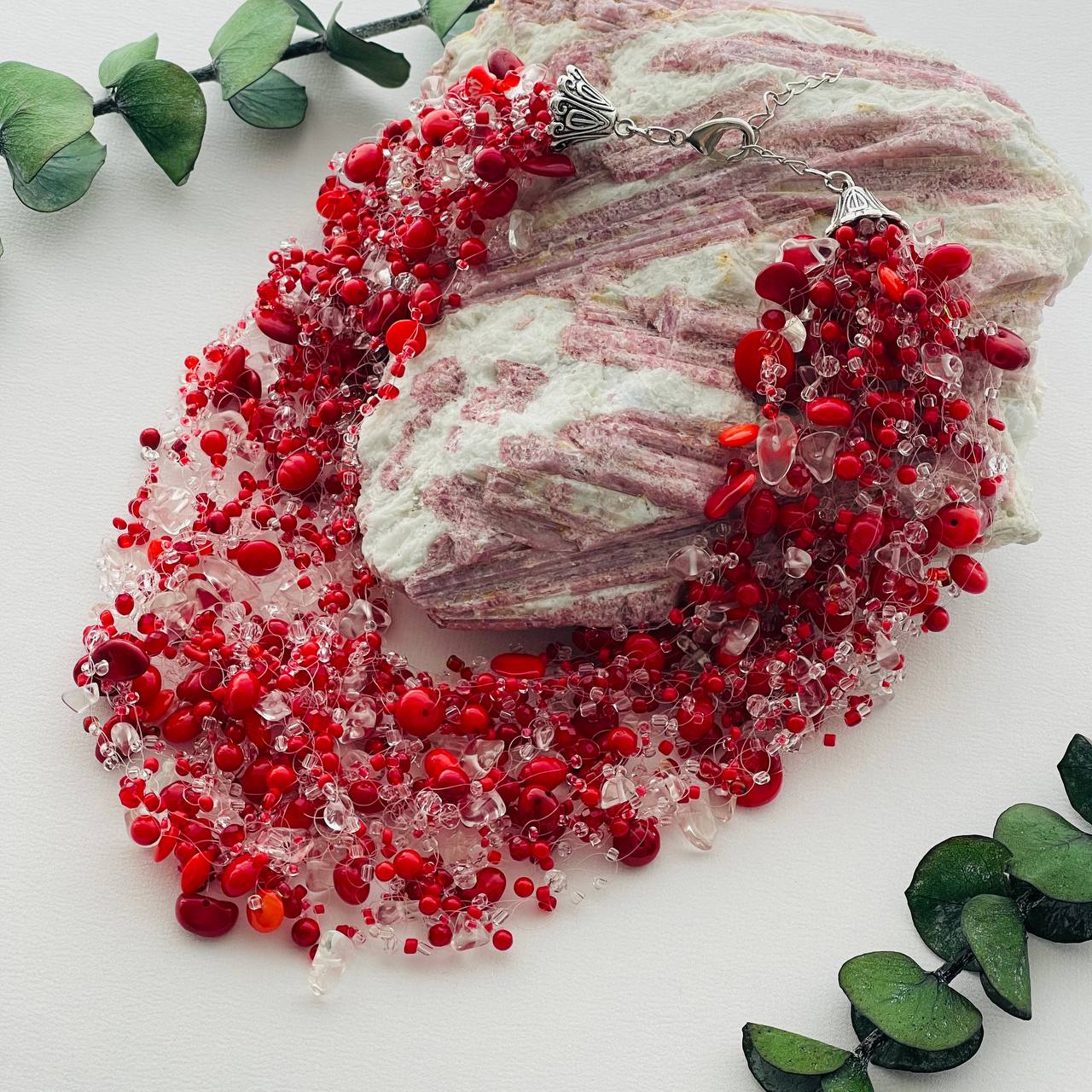 Радуга Самоцветов Колье "Воздушное" Коралл, Хрусталь