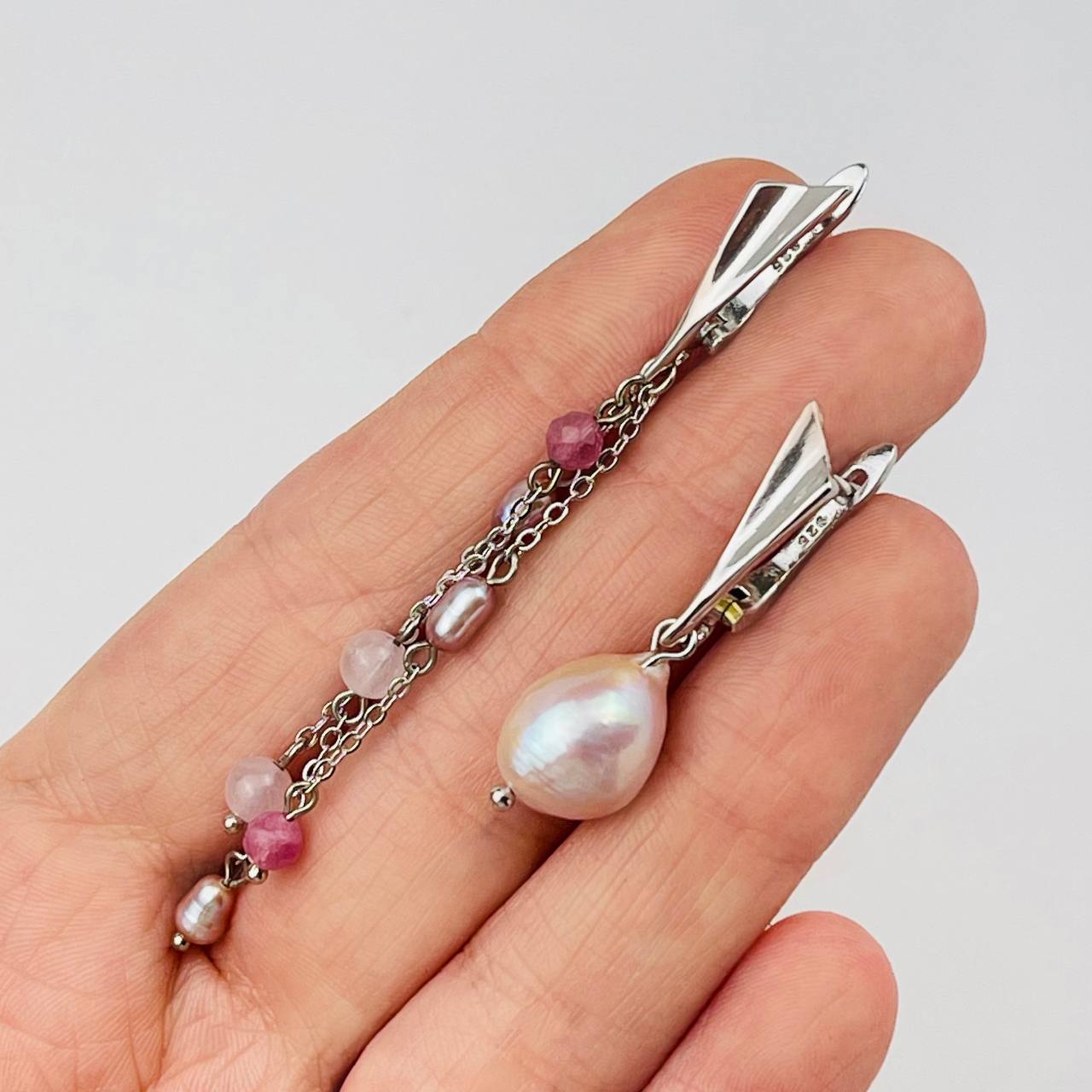 Радуга Самоцветов Серьги из Жемчуга,Розового кварца и Турмалина