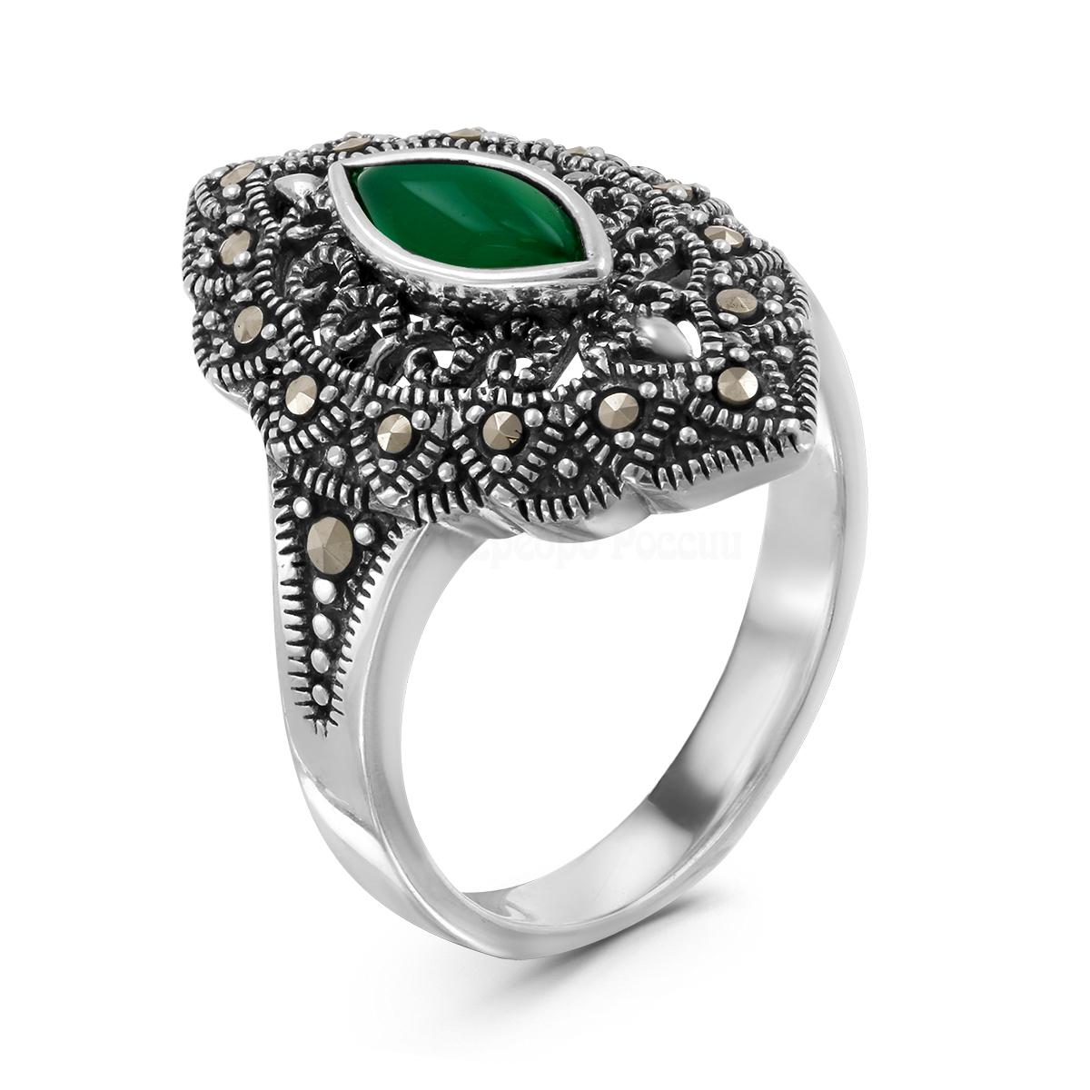 Кольцо из чернёного серебра с нат.зелёным агатом и марказитами