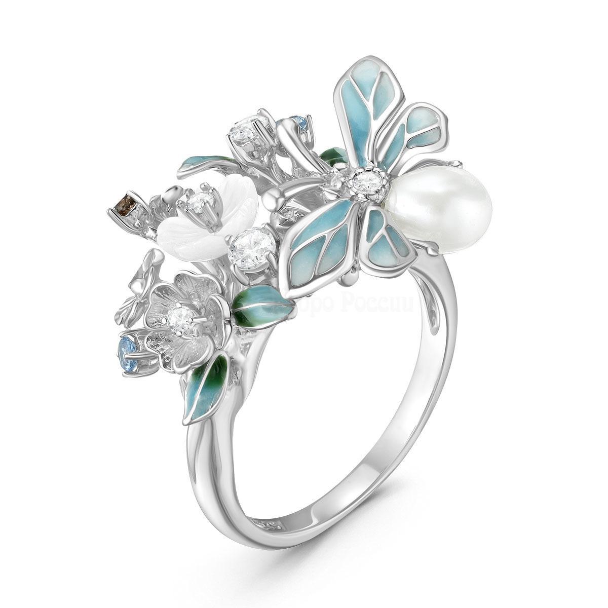 Кольцо из серебра с культ.жемчугом, перламутром, юв.стеклом, куб.цирконием и эмалью родированное