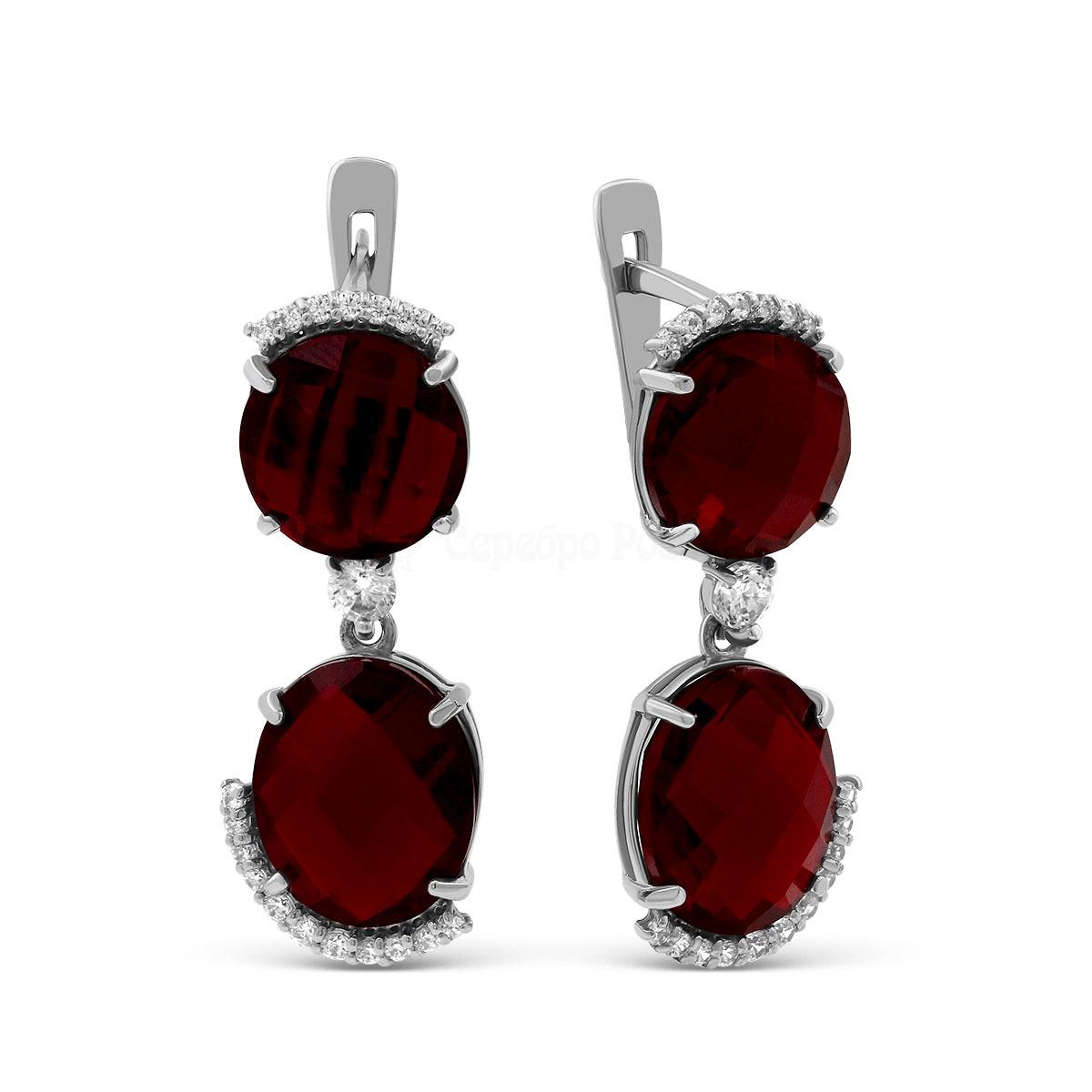 Серьги из серебра с рубиновым корундом и фианитами родированные