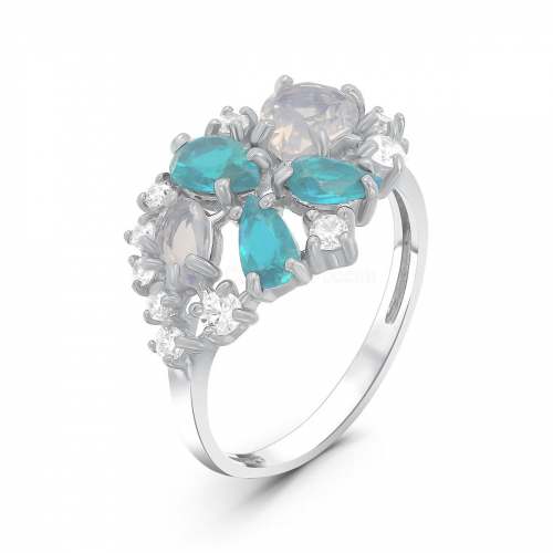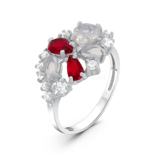 Кольцо из серебра с пл. кварцем цв. лунный камень, цв. гранат и фианитами родированное