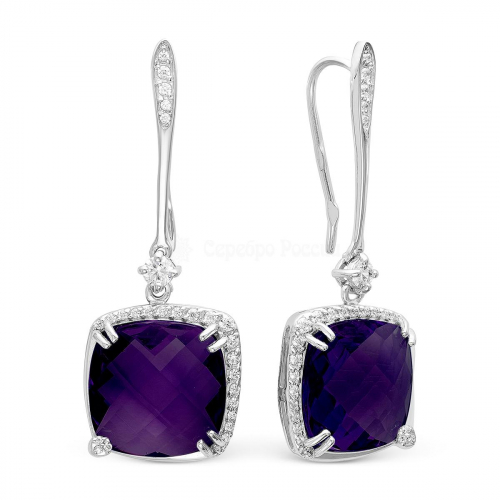 Серьги из серебра с кварцем аметист и фианитами родированные