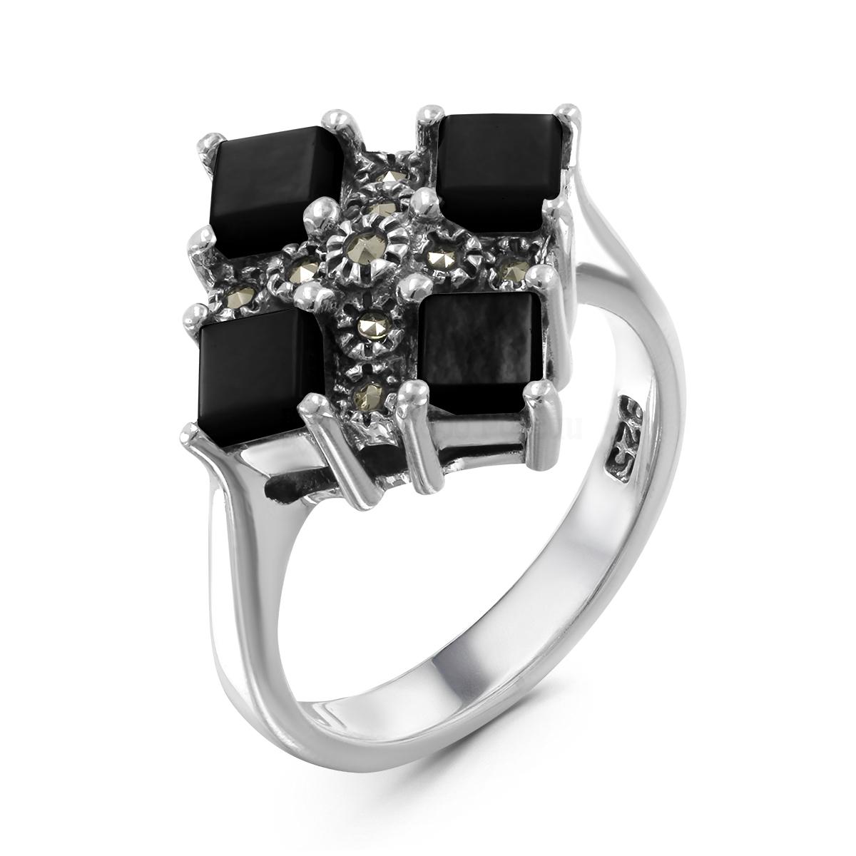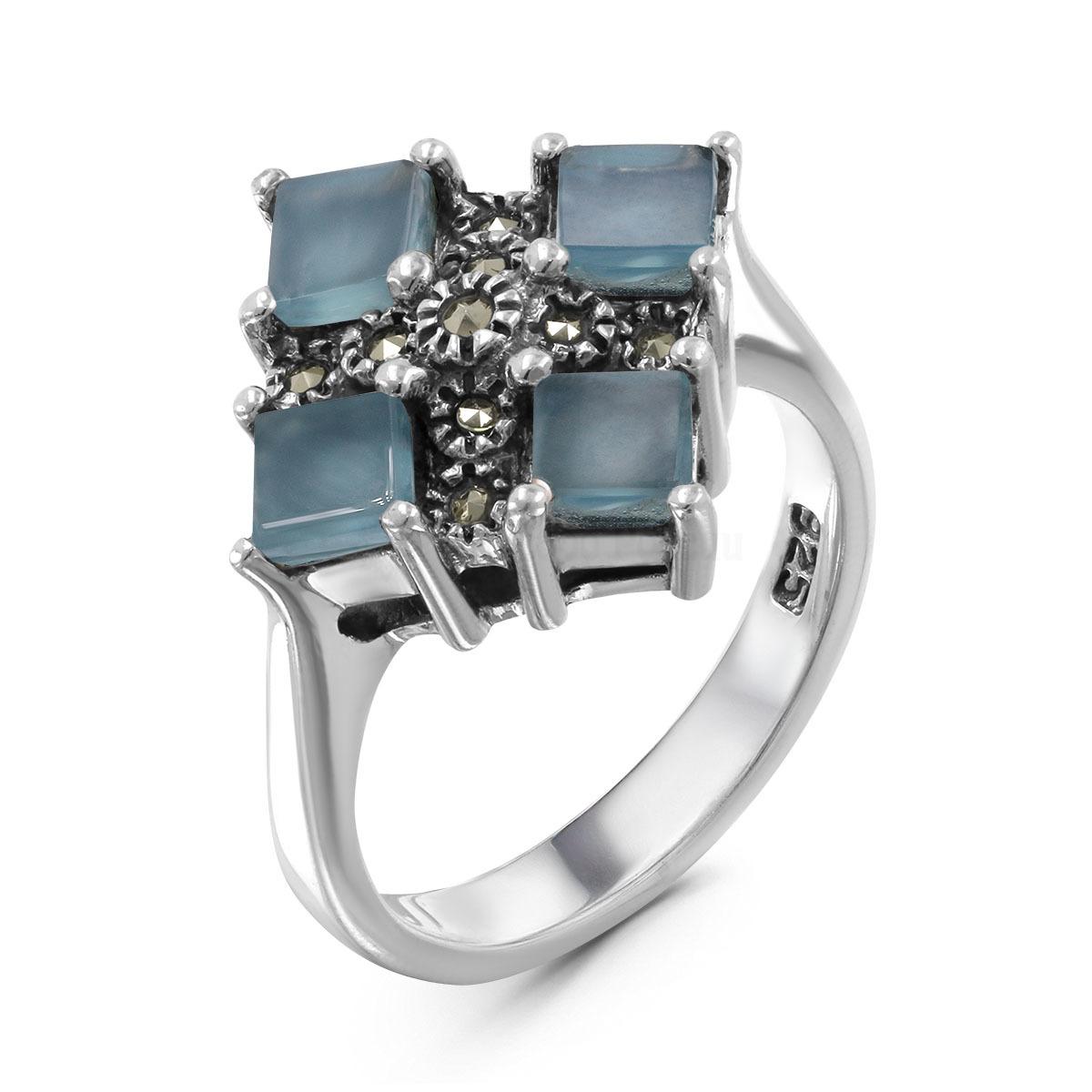 Кольцо из чернёного серебра с нат.голубым халцедоном и марказитами