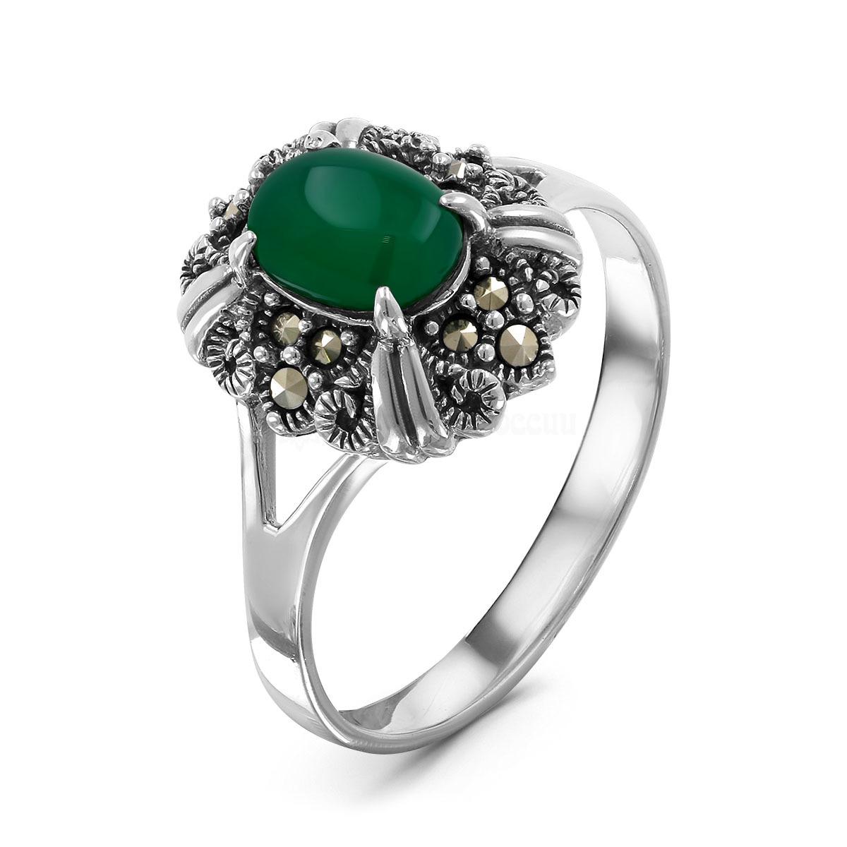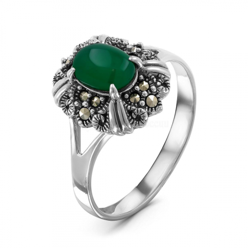 Кольцо из чернёного серебра с нат.зелёным агатом и марказитами
