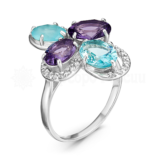 Кольцо из серебра с пл. кварцем цв.топаз, цв.аметист и фианитами родированное