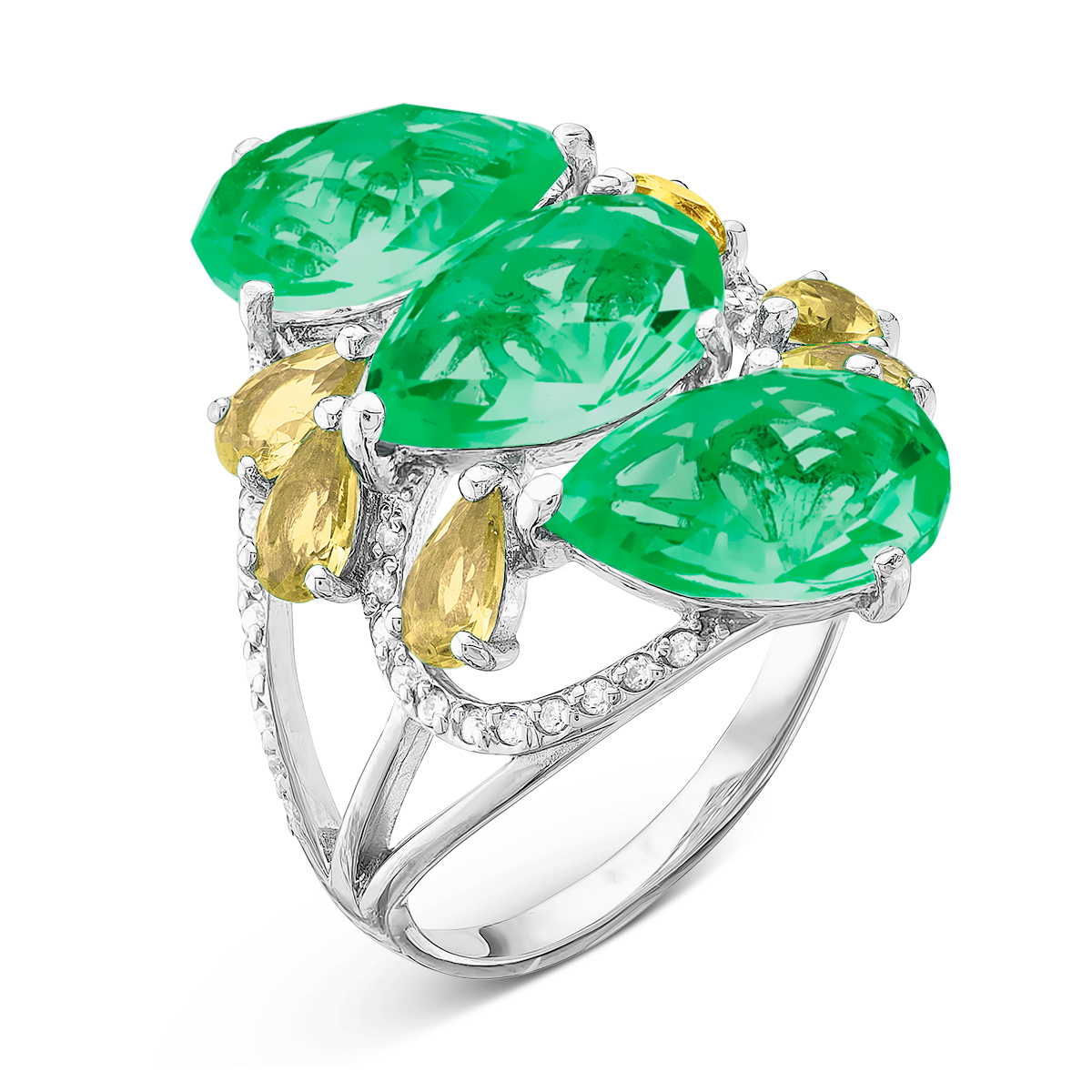 Кольцо из серебра с пл. кварцем цв.хризопраз и фианитами родированное