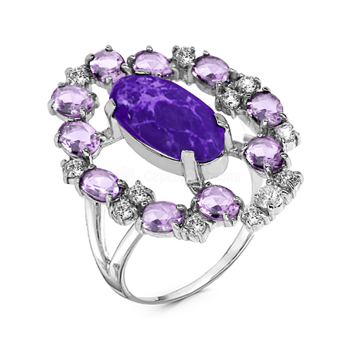 Кольцо из серебра с рек.чароитом,пл.кварцем цв.аметист и фианитами родированное
