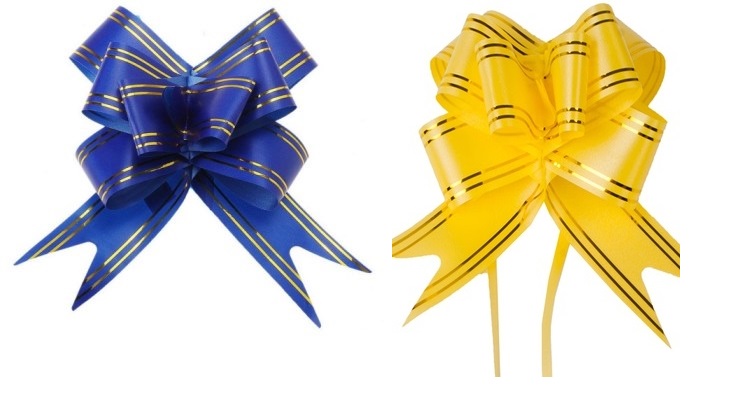 Бант-бабочка с золотой полосой – элегантное дополнение к подарочной упаковке, букету. Формирование банта занимает пару секунд, а выполнять функцию украшения он будет не один месяц. Привлекательный бантик можно прикрепить к любому материалу, зафиксировав его клеем, степлером или нитками.