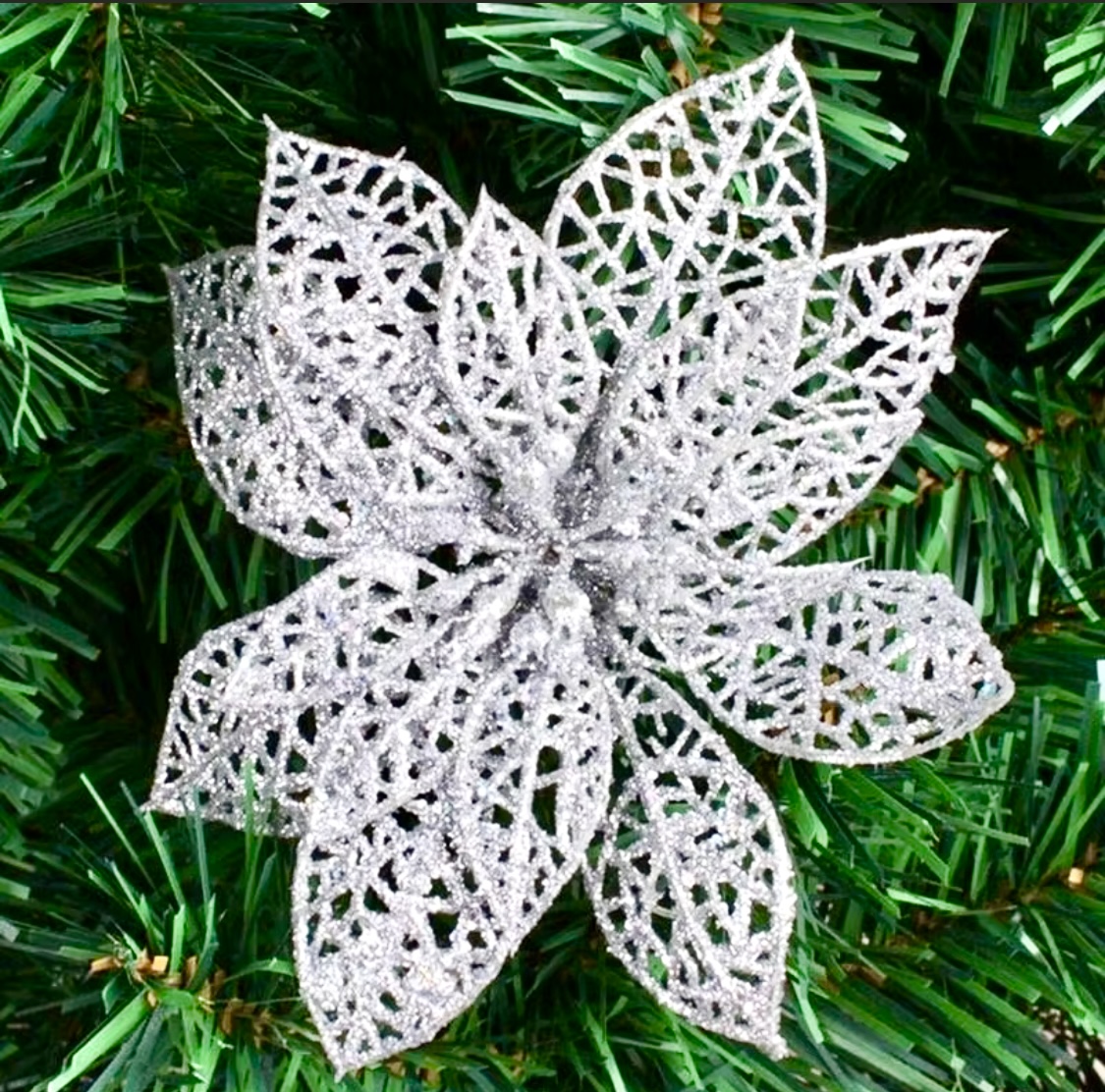 Декоративный цветок прекрасно подходит для новогоднего украшения интерьера. Могут использоваться для декора жилых помещений, офисов и торговых точек. Изделие можно подвешивать к потолку, создавая великолепные композиции. Цветок покрыт блестящей крошкой, поэтому он так красиво переливается и создаёт волшебную праздничную атмосферу.