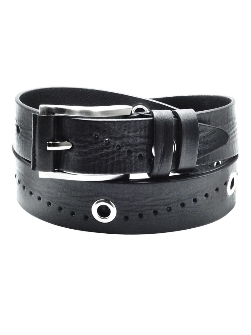 Изделие с гладкой поверхностью, полоса декорирована люверсами и перфорацией, пряжка обтянута кожей.