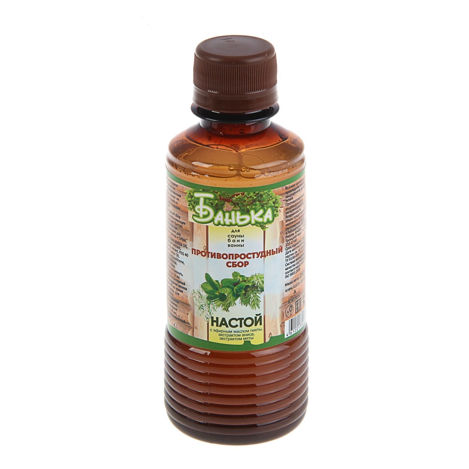 Настой для бани «Противопростудный» с эфирным маслом пихты, экстрактом аниса и мяты оказывает противовоспалительное, противовирусное и общеукрепляющее действие, активизирует иммунную систему.
