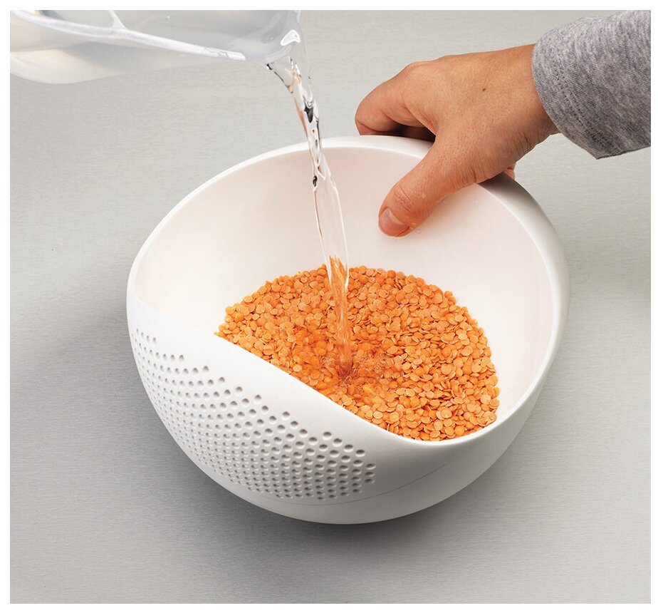 Удобная ёмкость, которую можно использовать как дуршлаг, как миску или как сервировочное блюдо. С ней легко помыть фрукты и овощи, а так же промыть крупу, для слива достаточно наклонить ее под небольшим углом), а затем — сразу же подавать на стол. Избавляет от необходимости  держать под  рукой сразу множество ёмкостей. Эргономичная рукоятка обеспечивает дополнительный комфорт, а нескользящее основание — идеальную устойчивость.