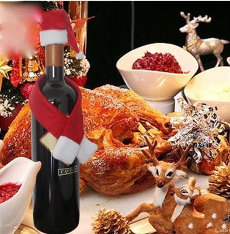 Очень новогодние и не слишком навязчивые украшения для бутылок на праздничном столе. Шарфик для горлышка и шапочка на пробку – «укутанное» праздничное вино теперь не нужно будет прятать под стол.