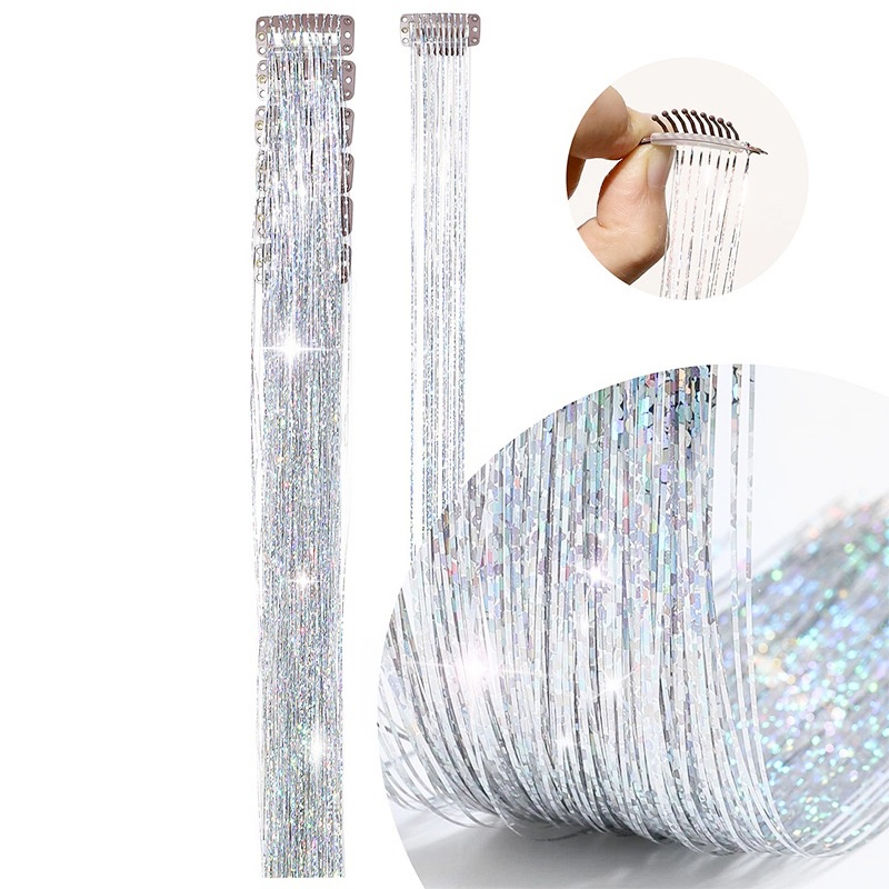 Прядь для волос представляет собой серебряный дождик, который крепиться заколкой. Пряди можно использовать в качестве дополнения на праздник или вечеринку, детский утренник или карнавал.