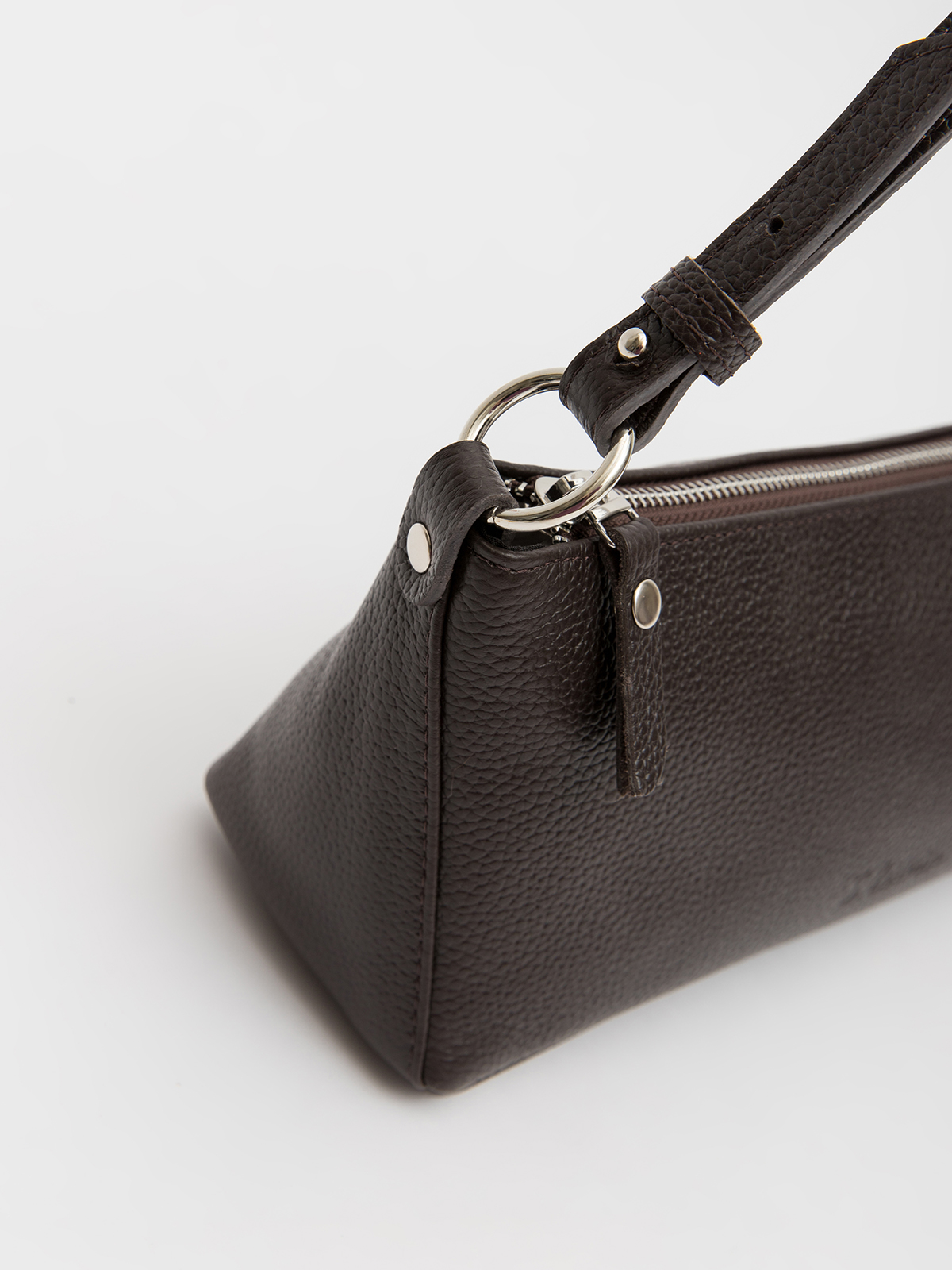 Короткий ремень – функциональный элемент в сумке, также служит декором, благодаря шлевкам и фурнитуре.