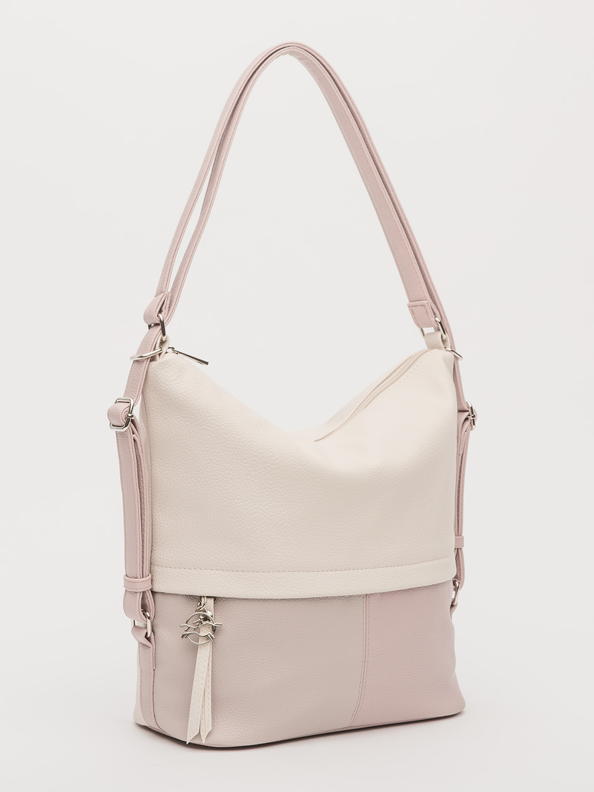 Модель легко меняет форму, позволяя носить её на плече, через плечо или как рюкзак — в зависимости от ситуации. Сочетание нескольких цветов делает сумку стильным акцентом в любом образе. Внутри — продуманная организация: основной отдел, карман на молнии для ценных вещей, отделение для телефона и дополнительный большой карман. Функциональность и неординарный дизайн в одной сумке — идеальный выбор для тех, кто ценит комфорт и возможность всегда иметь под рукой всё необходимое.