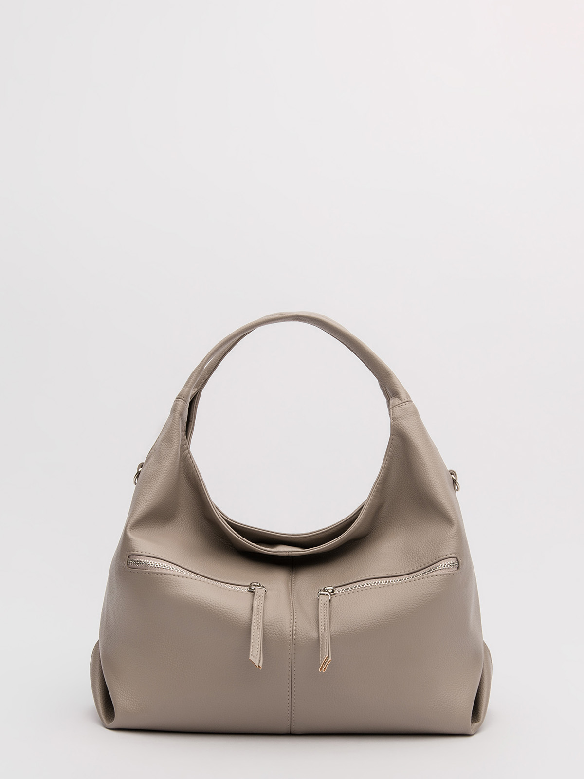 Мягкая форма с разрезной передней частью и двумя карманами на металлической молнии (с кожаными наконечниками бегунков) выглядит объемной, но сохраняет аккуратность. Ручки, плавно переходящие в корпус, создают цельный гармоничный силуэт.