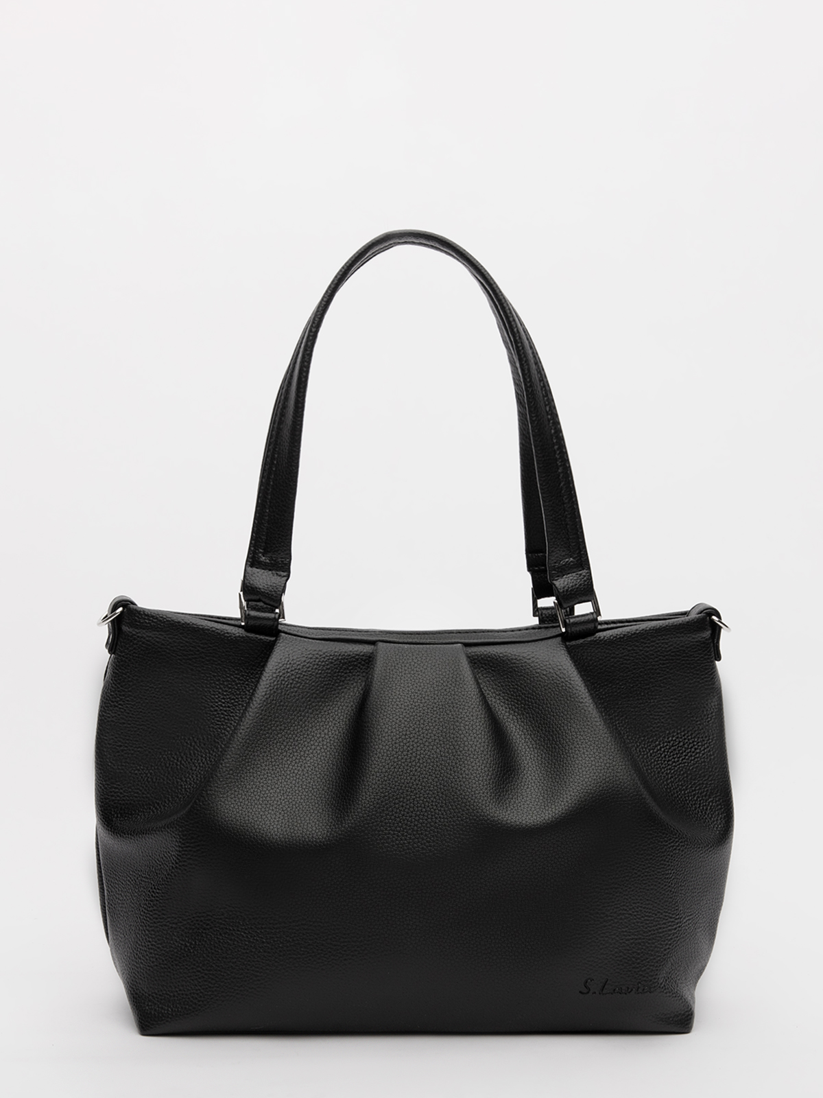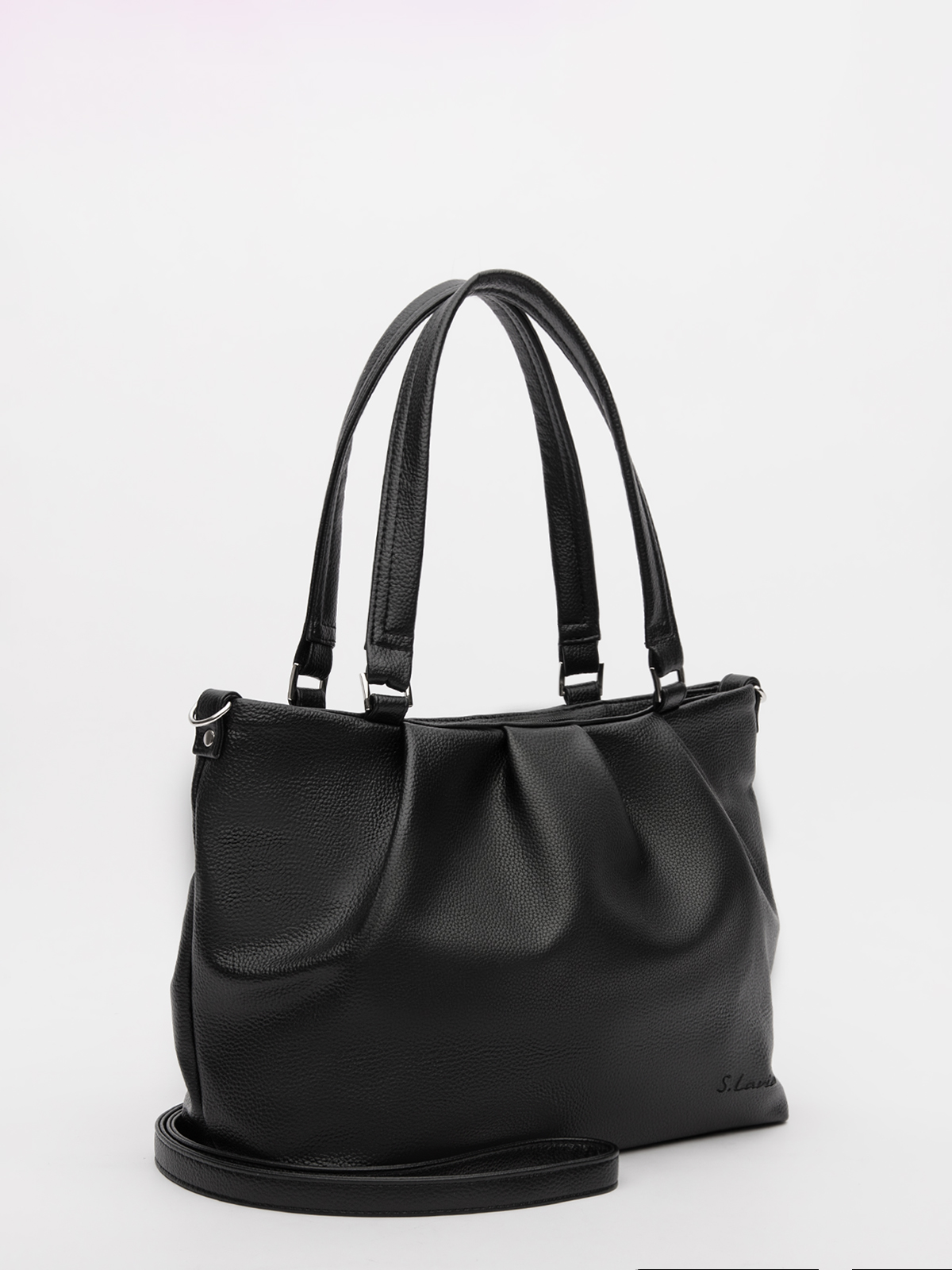 Трендовый силуэт вытянутого прямоугольника со стильными складками создаёт дополнительный объём и добавляет образу лёгкую женственность. Удобные ручки средней длины и съёмный ремень предлагают варианты ношения — от классического до более свободного. Литой декор и брендированная фурнитура подчёркивают статусность аксессуара.