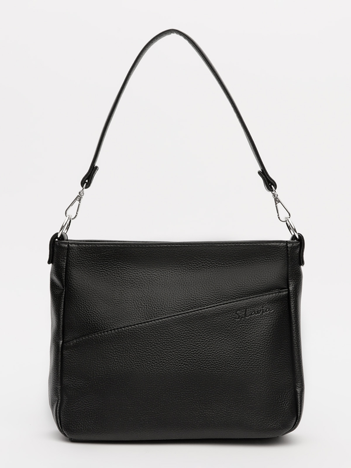 Геометричная форма с диагональным карманом и естественной складкой верха создаёт стильный женственный силуэт. В комплекте — съёмная короткая ручка и регулируемый ремень для разных вариантов ношения: в руке, на плече или через плечо.