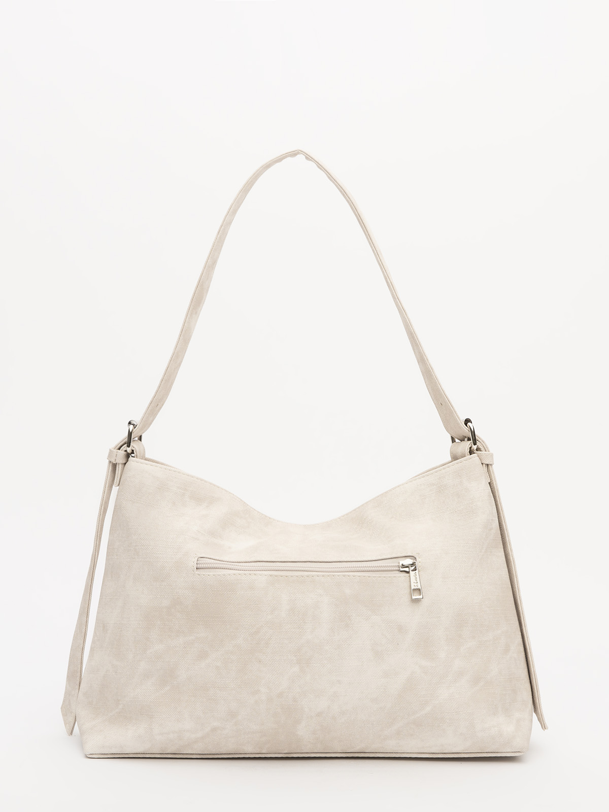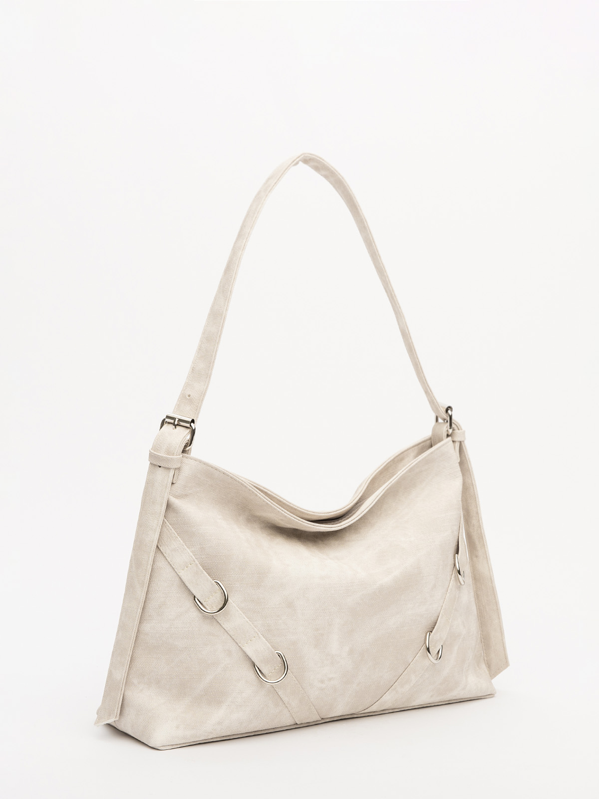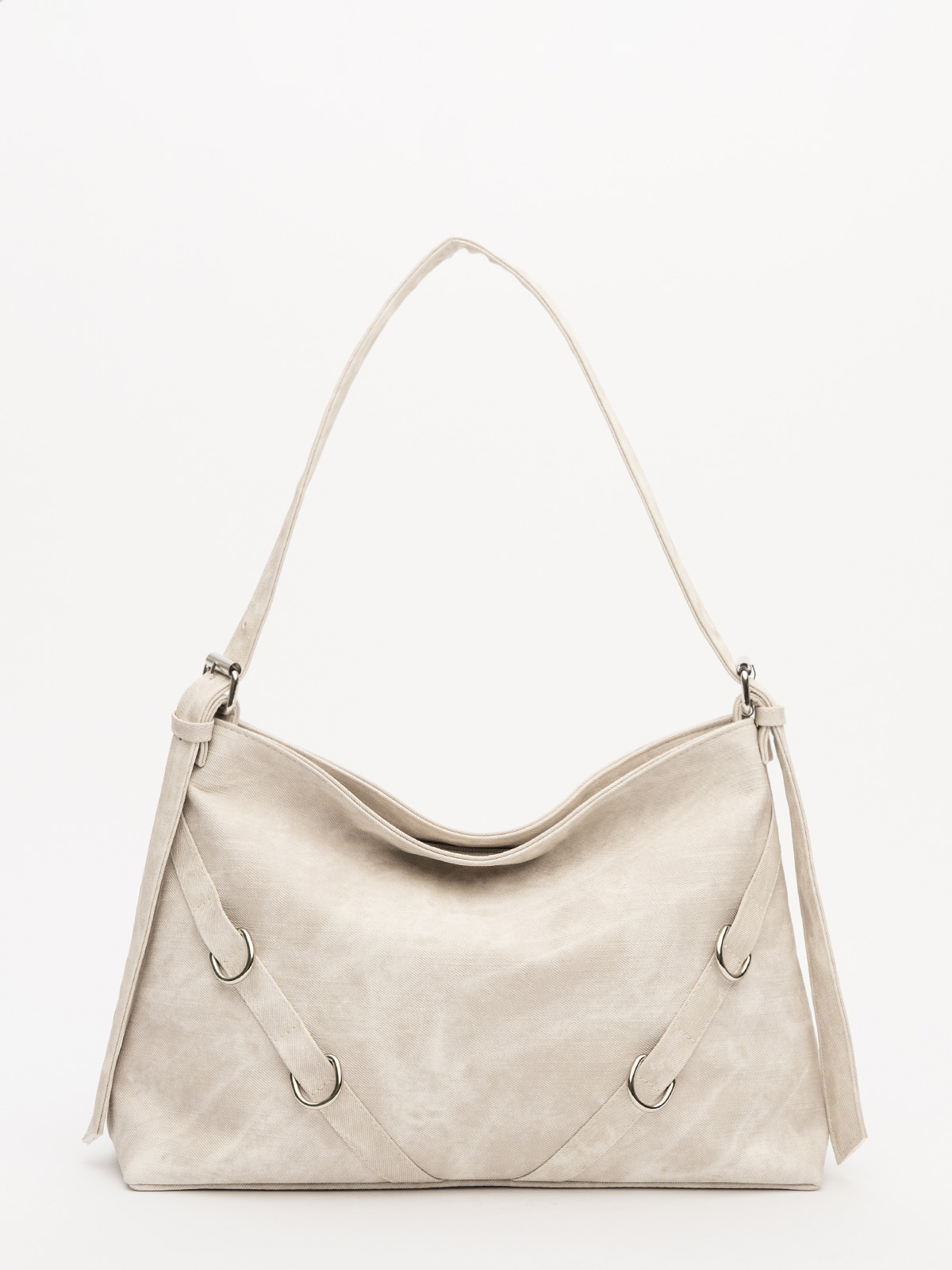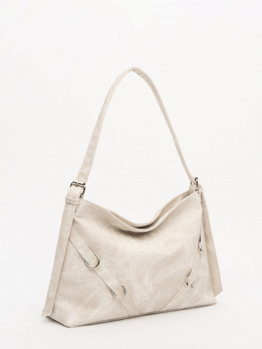 Элегантная форма хобо с декоративными ремнями и металлической фурнитурой представлена в нежном молочном оттенке. Сочетание винилискожи с отделкой под деним и эффектом тай-дай делает модель стильным акцентом в любом образе.