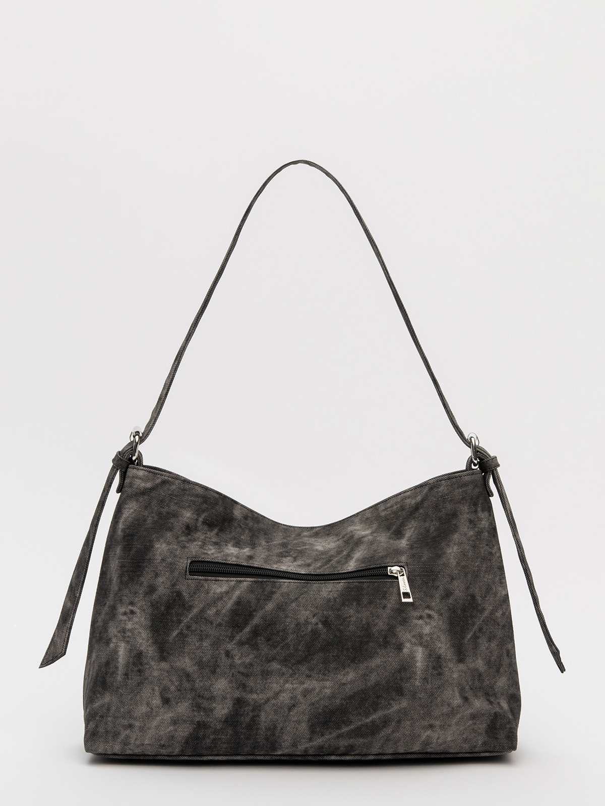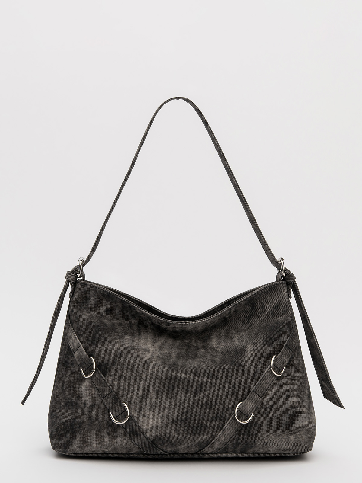 Элегантная форма хобо с декоративными ремнями и металлической фурнитурой представлена в тёмно-сером оттенке. Сочетание винилискожи с отделкой под деним и эффектом тай-дай делает модель стильным акцентом в любом образе.