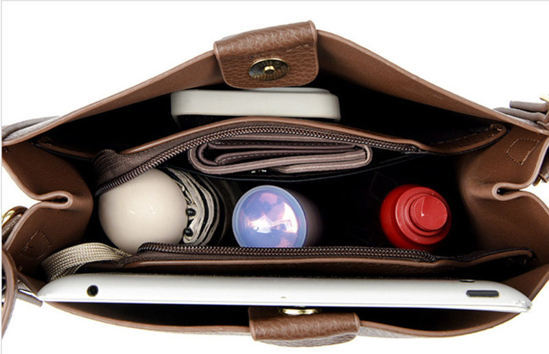Внутри: 3 независимых отделения, среднее из которых на молнии, крайние отделения закрываются на кнопку-магнит.