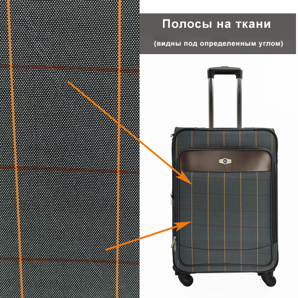 1) две полосы на ткани на передней стенке чемодана, образованные в процессе прессовки материала на подложку EVA (видны под определенным углом);
