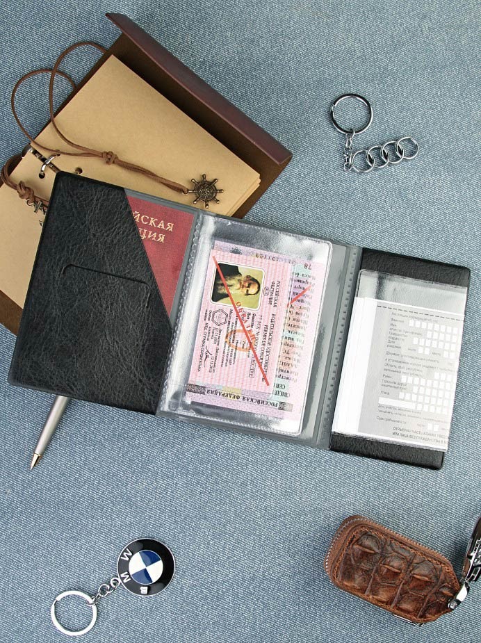 Многофункциональная обложка для паспорта и автодокументов. Изготовлена из искусственной кожи высокого качества. Дополнительные отделения для пластиковых карт. Съёмный пластиковый карман для регистрации временного пребывания иностранного гражданина. Вкладыш для автодокументов имеет 6 прозрачных файлов: 1 файл для водительского удостоверения (60х88 мм), 4 файла для СТС (85х125мм), 1 файл для страхового полиса или доверенности формата А5 (150 х 216мм).