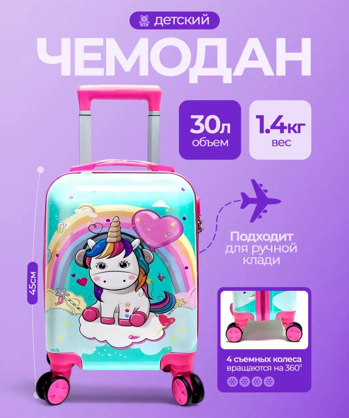 — Детский чемодан изготовлен из прочного материала поликарбонат.