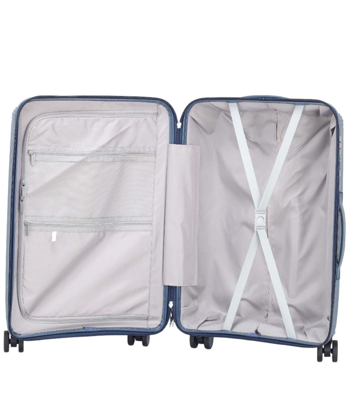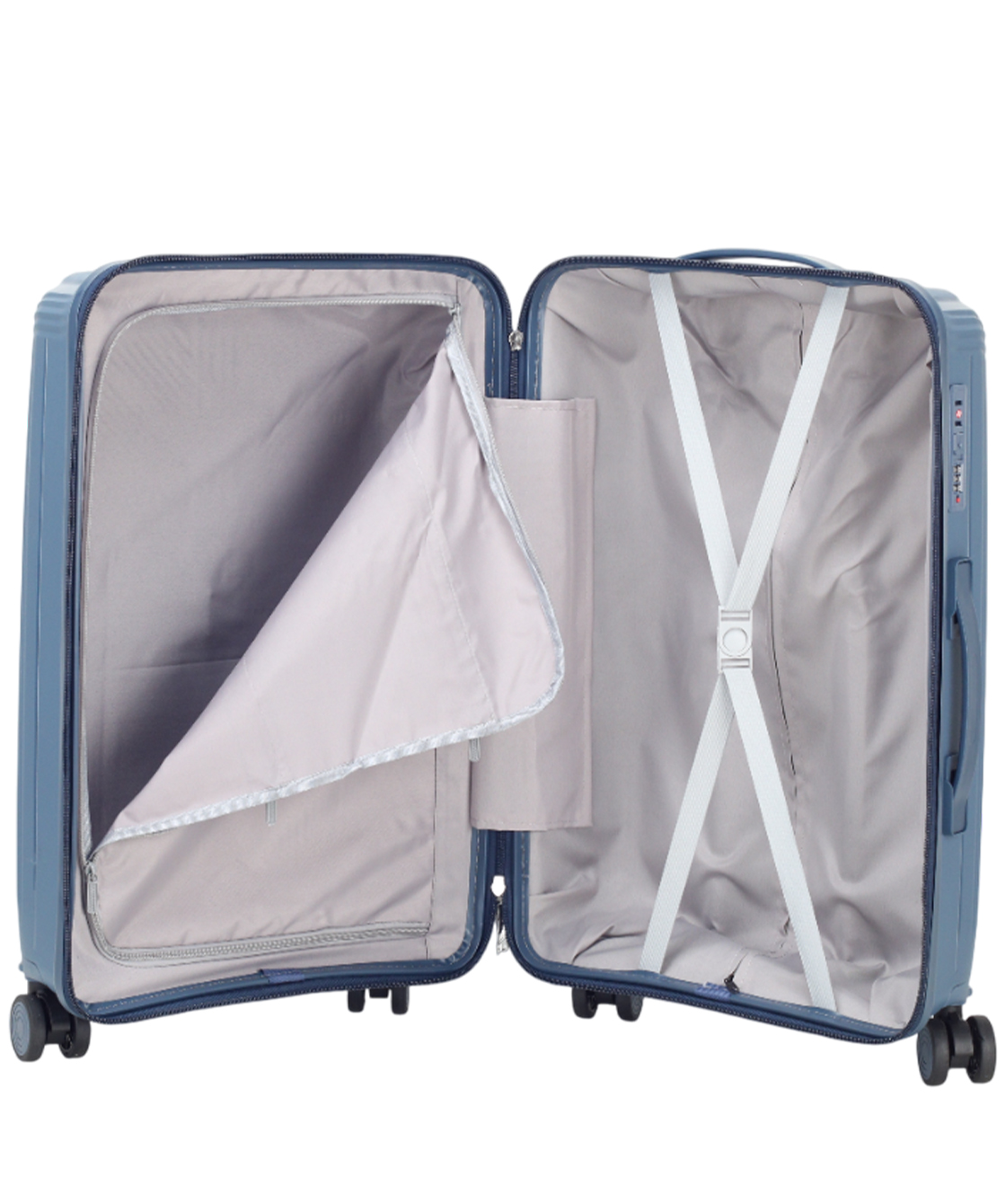 — Чемодан разделён на две части, в одной части есть ремни для фиксации багажа, вторая часть имеет тканевую переоородку которая закрывается на молнию и дополнительный карман в виде сетки, который закрывается на молнию.