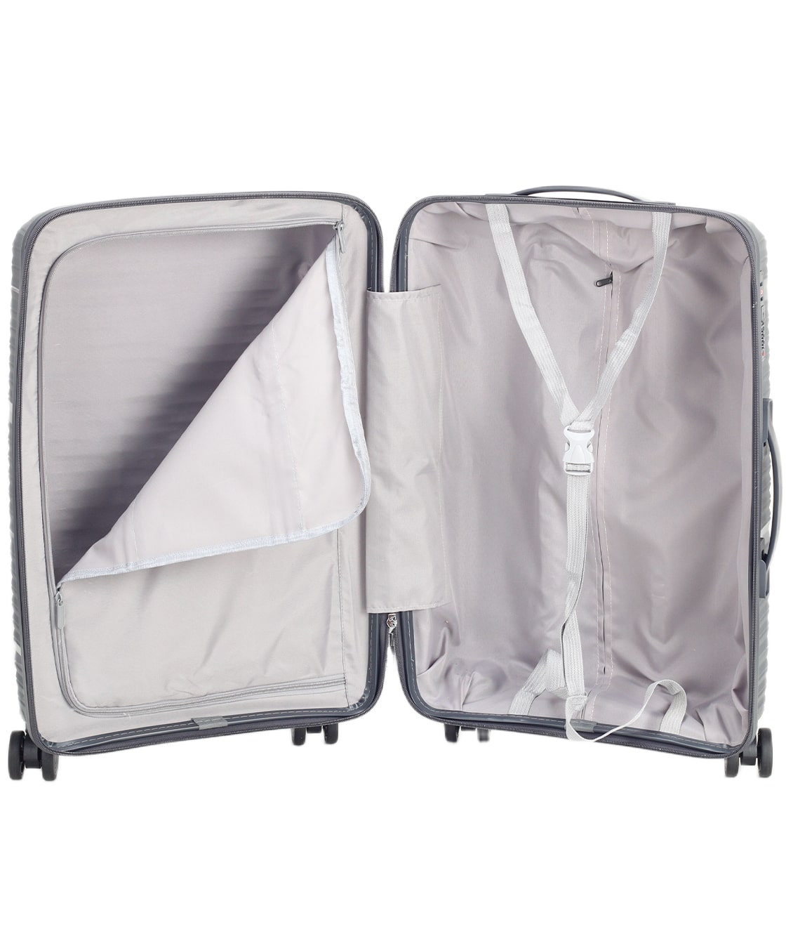 — Чемодан разделён на две части, в одной части есть ремни для фиксации багажа, вторая часть имеет тканевую переоородку которая закрывается на молнию и дополнительный карман в виде сетки, который закрывается на молнию.
