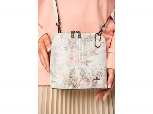 Белый цвет с легким эффектом перламутра. В комплекте длинный ремень с возможностью регулировки. Внутри: два отделения, между ними перегородка в виде кармана на молнии. Дополнительно два кармана для аксессуаров, один из которых застегивается на молнию. Снаружи: сзади карман для мелочей на молнии.