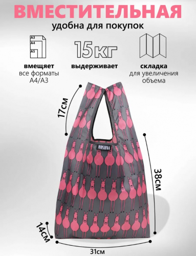 Для того чтобы сложить сумку, нужно вывернуть кармашек наружу, сложить сумку вдоль по ширине кармашка, затем загнуть ручки, сложить поперек два раза и засунуть в кармашек
