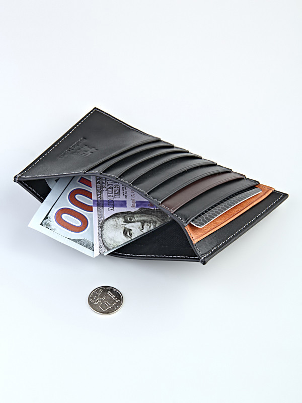 Картхолдер выполнен из натуральной кожи. Вместительный холдер убережет карты, права, купюры от потери и они всегда будут под рукой, карты легко вставляются и легко достаются из ячеек. В картхолдере предусмотрен основной карман свободного назначения размером 135*90мм, с лицевой стороны есть 9 отсеков под пластиковые карты, с тыльной стороны есть 1 карман для мелочи на молнии.