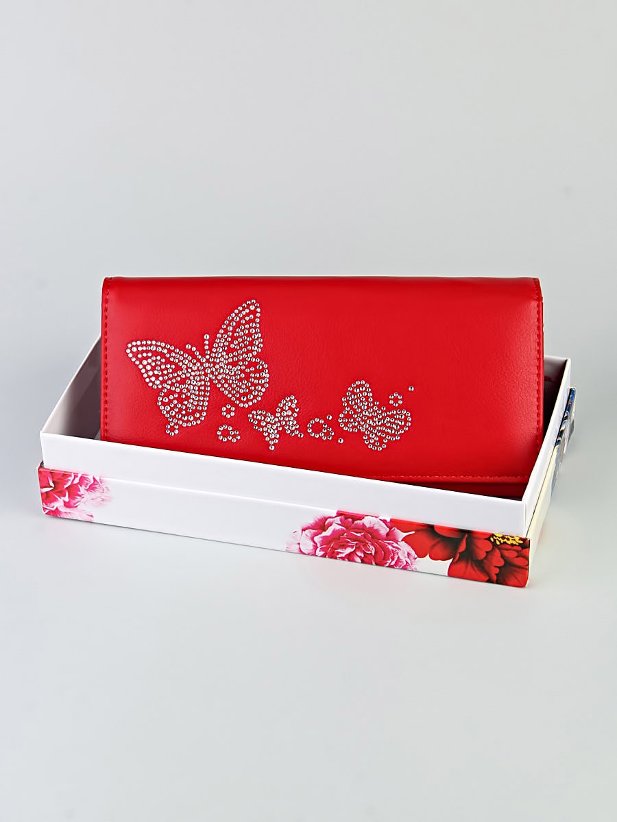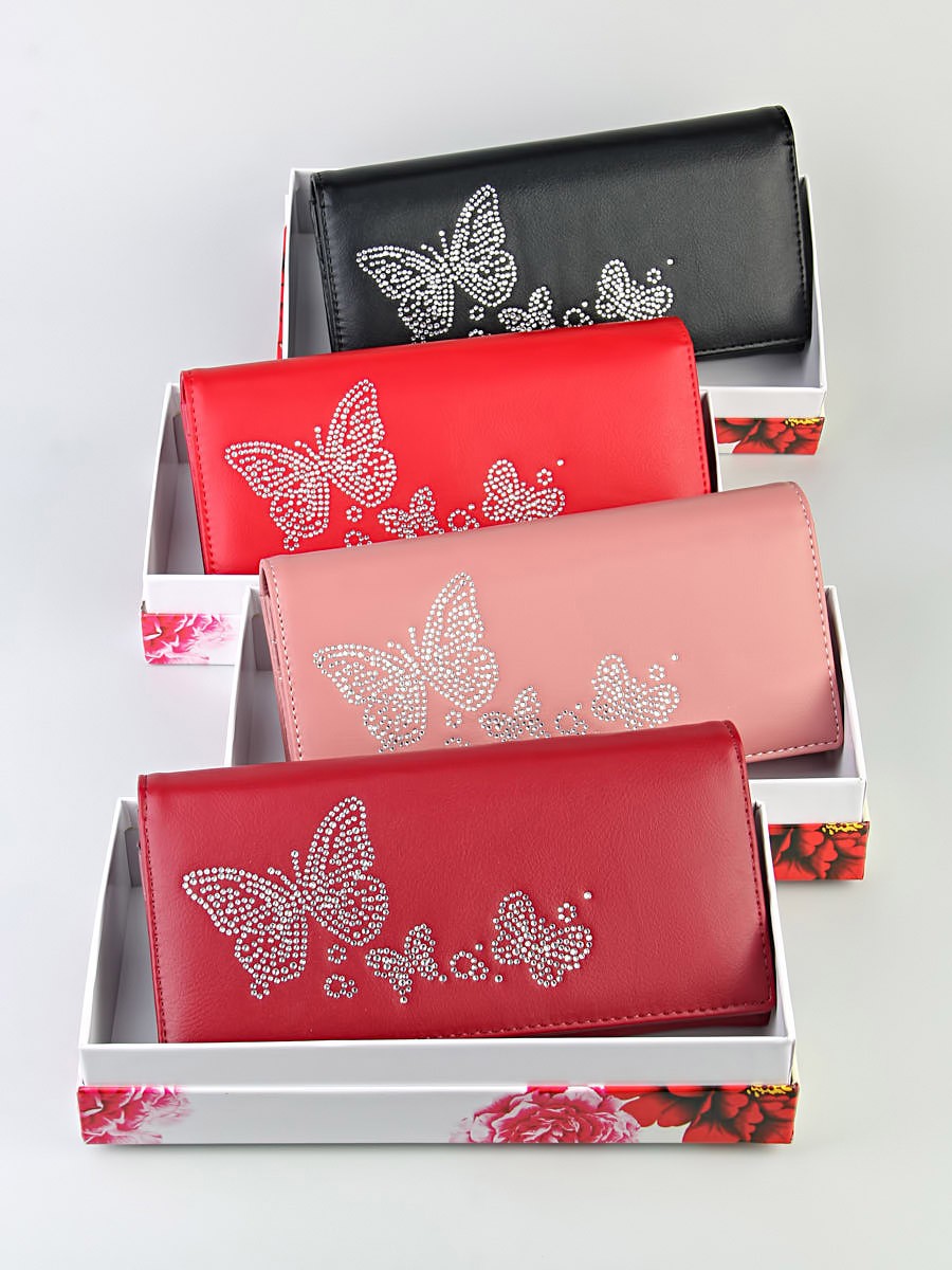 Изделие имеет одно основное отделение, в котором пять отсеков. Один из них закрывается на молнию, а еще один на фермуар. Кошелек имеет восемь отсеков для карт и потайной отдел для купюр. С лицевой стороны декорирован стразами.