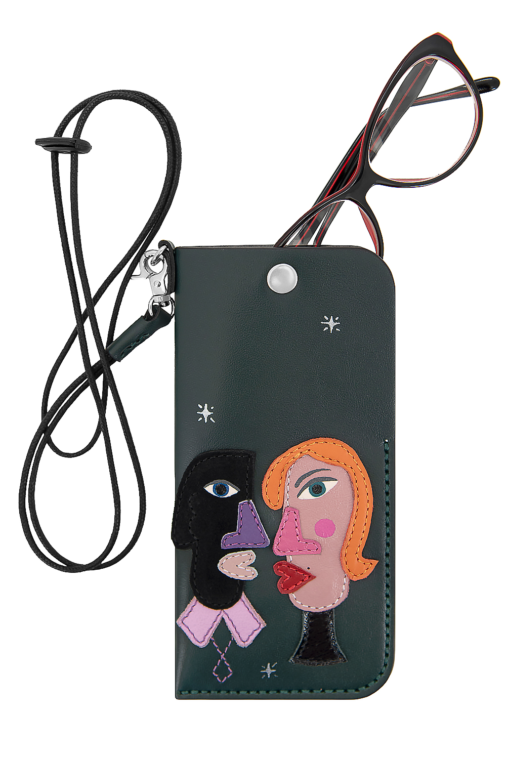Футляр для очков ручной работы с аппликацией "Абстракция №5". Прошит вощеной нитью. В комплекте с ним шнур с карабином длиной 108см. Идеальный вариант для работы в офисе, прогулок и походов в магазин. Футляр с аппликацией в заказе может незначительно отличаться от оригинала (фото) по фактуре и оттенку кожи.