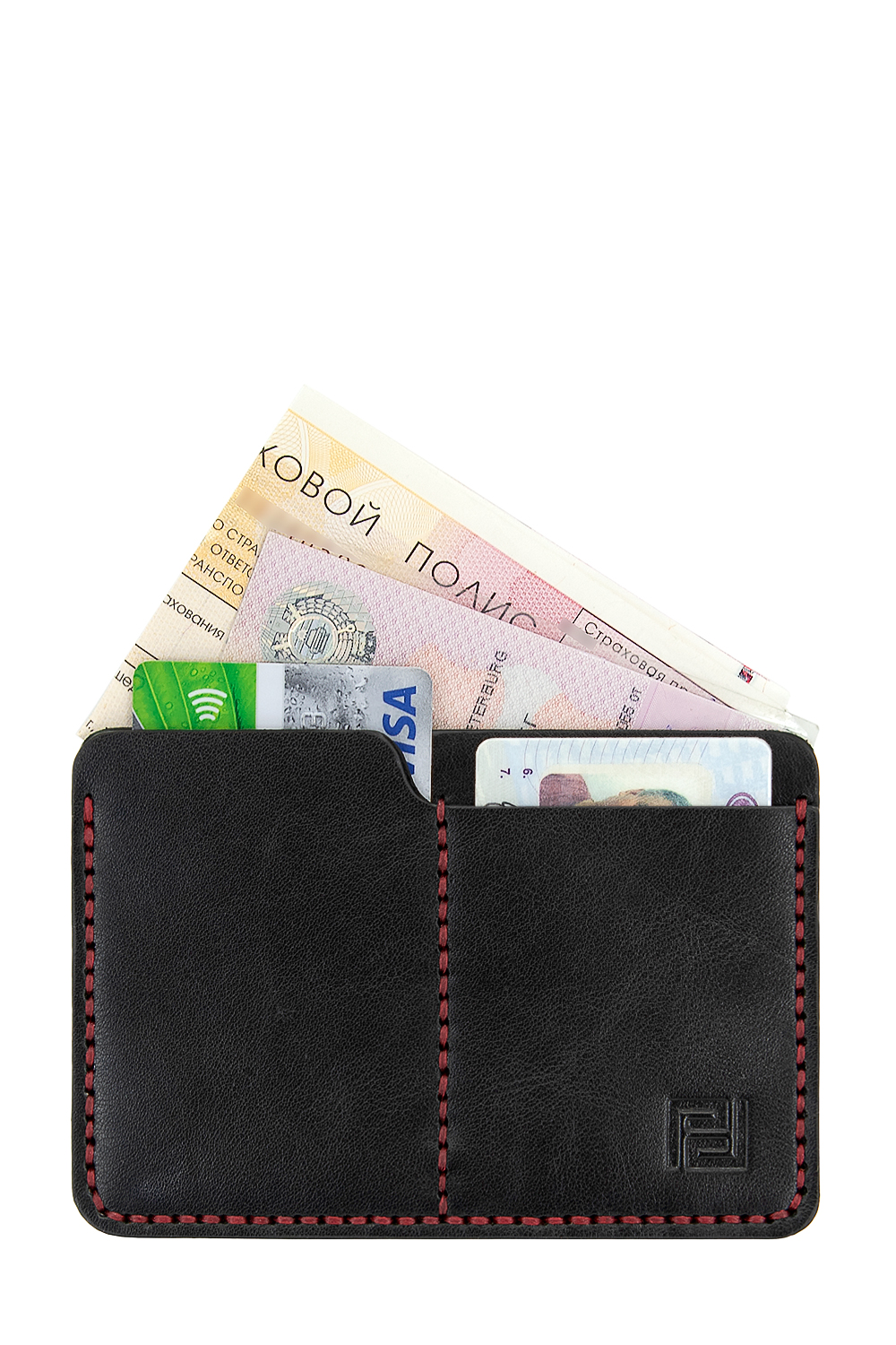 Вместимость: два отделения для банковских карт (один из них используется под водительское удостоверение), большое отделение для СТС и под денежные купюры сложенные пополам. Без подкладки.